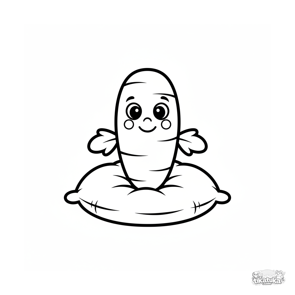 Простая раскраска для детей 2-3 лет: улыбающаяся плюшевая морковка сидит на подушке. Крупные четкие контуры, почти нет фона, идеально для первых карандашей.