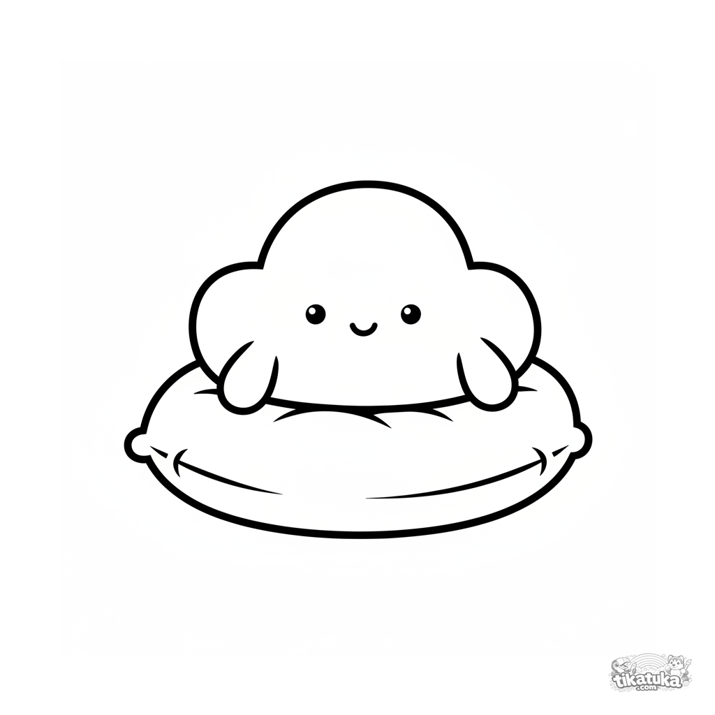 Раскраска для малышей: улыбающееся облачко отдыхает на подушке. Очень простые контуры, большие области для закрашивания, подходит для детей 2-3 лет.
