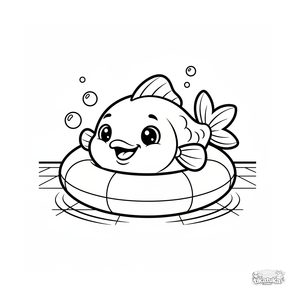 Раскраска для детей 4-6 лет: улыбающаяся рыбка играет в прятки, выглядывая из надувного круга на дне бассейна. Веселая сцена, четкие контуры.