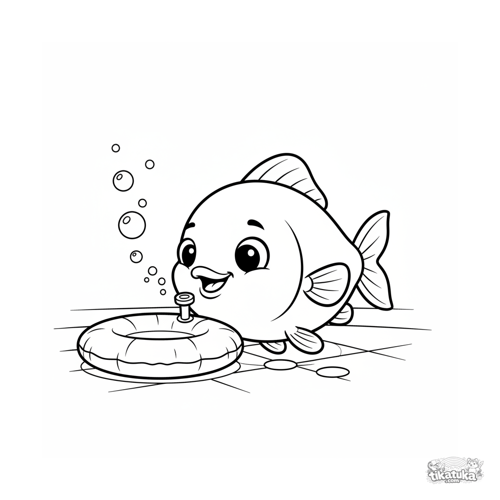 Раскраска для детей 4-6 лет: улыбающаяся рыбка с любопытством изучает клапан надувного круга, лежащего на дне бассейна. Ясная композиция, дружелюбный сюжет.