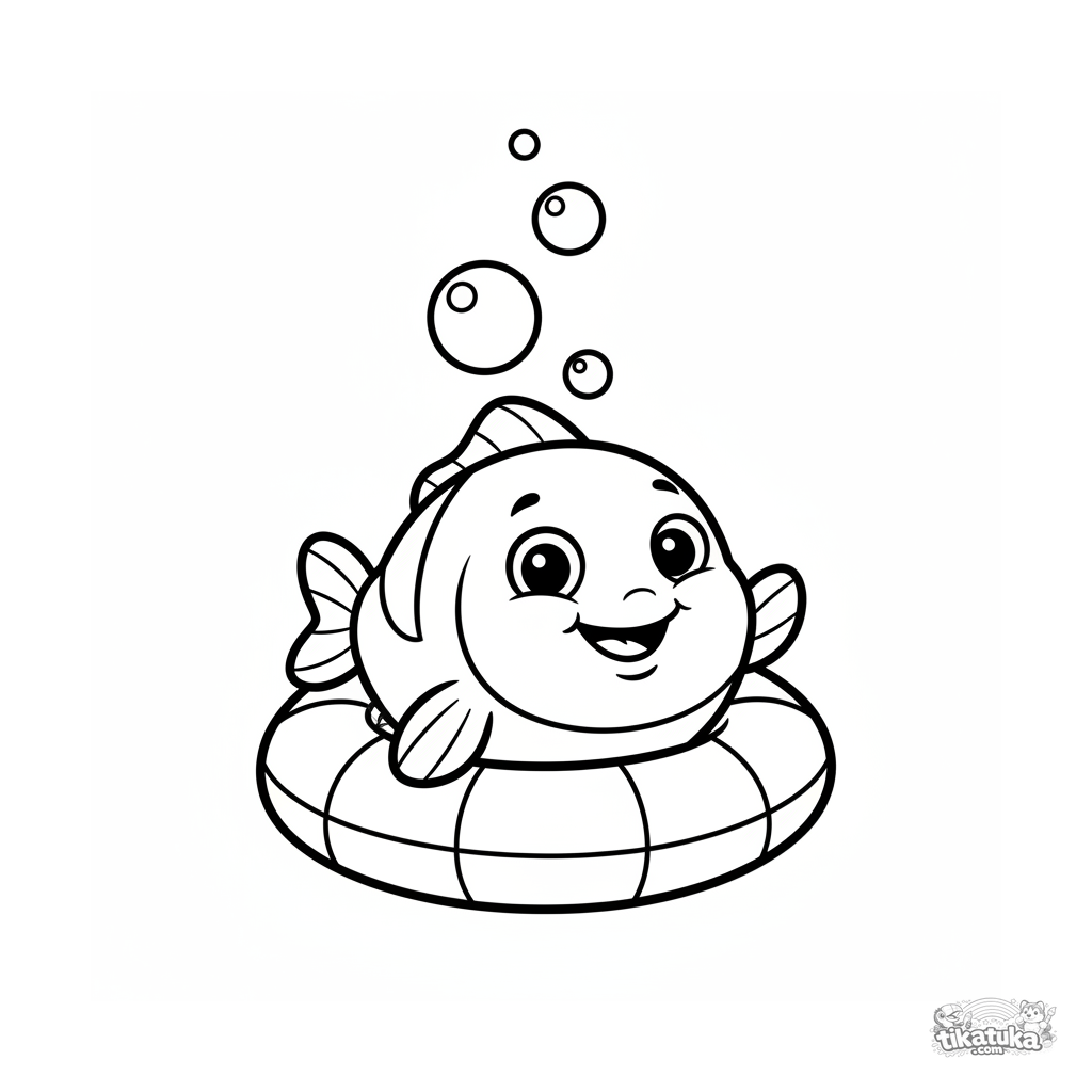 Очень простая раскраска для малышей 2-3 лет: улыбающаяся рыбка выглядывает из надувного круга в бассейне. Огромные, дружелюбные черты, простые формы.