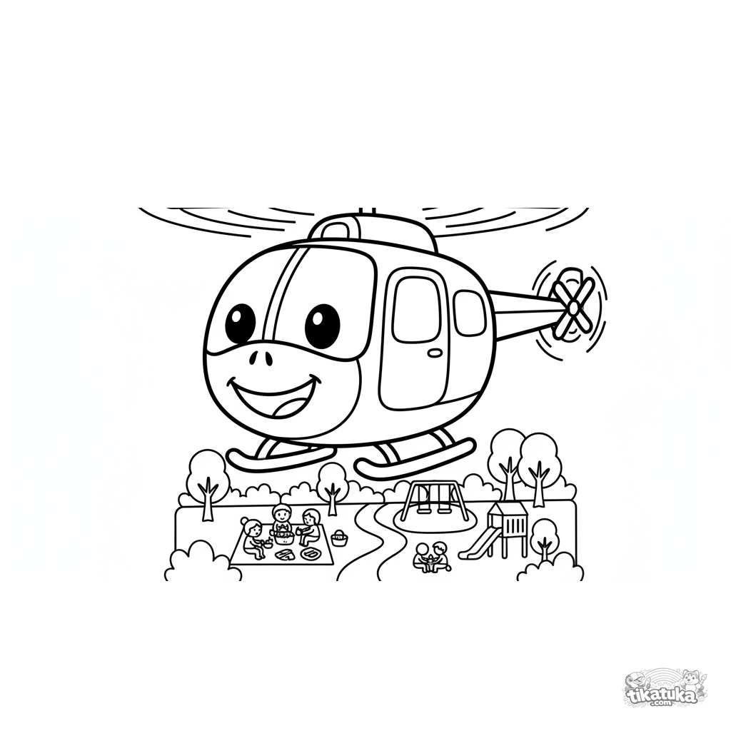 Простая раскраска для малышей 2-3 лет: весёлый вертолёт с лицом парит над парком. Крупные формы, толстые контуры, много свободного места.