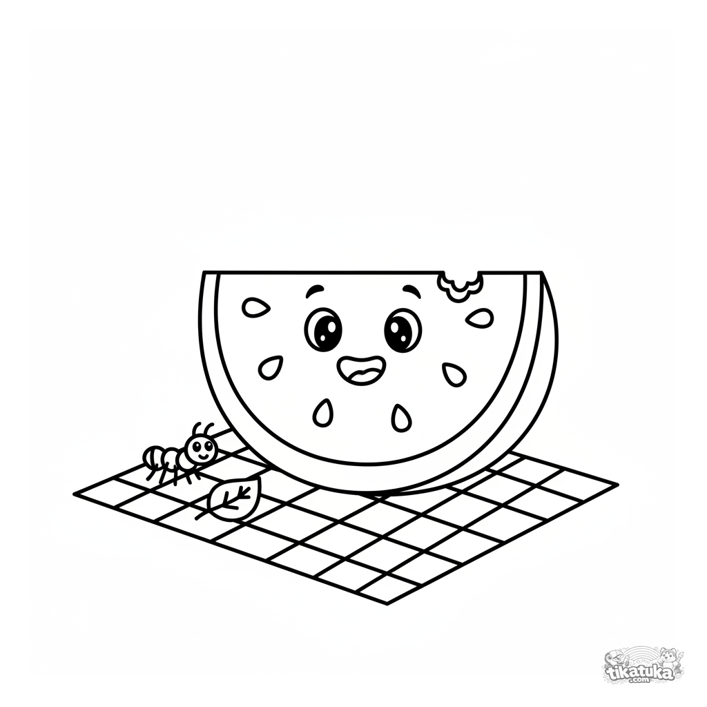 Простая раскраска для малышей: улыбающийся ломтик арбуза на пледе. Для детей 2-3 лет. Крупные простые формы, семечки и муравей рядом.