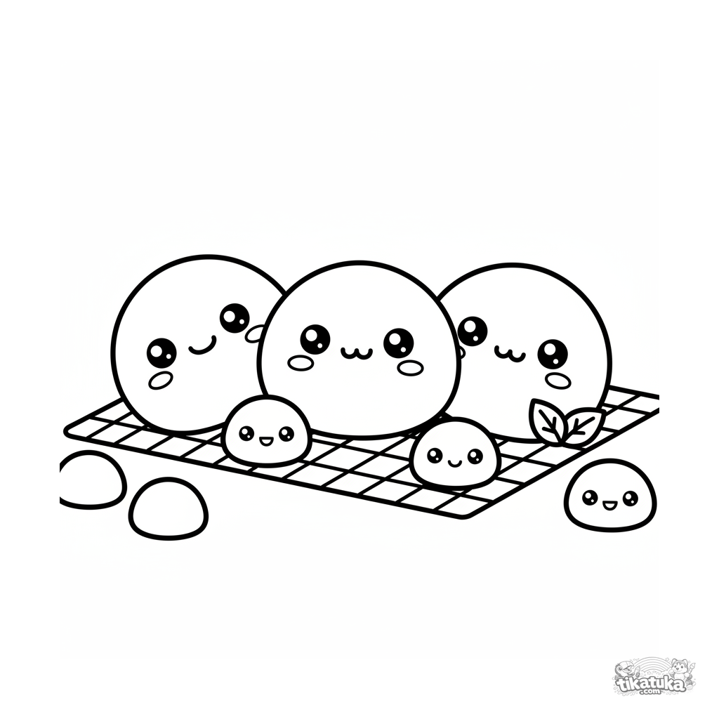 Раскраска для малышей: три улыбающихся клубничных моти на бамбуковой циновке. Простые формы и милые лица идеально подходят для самых маленьких художников.