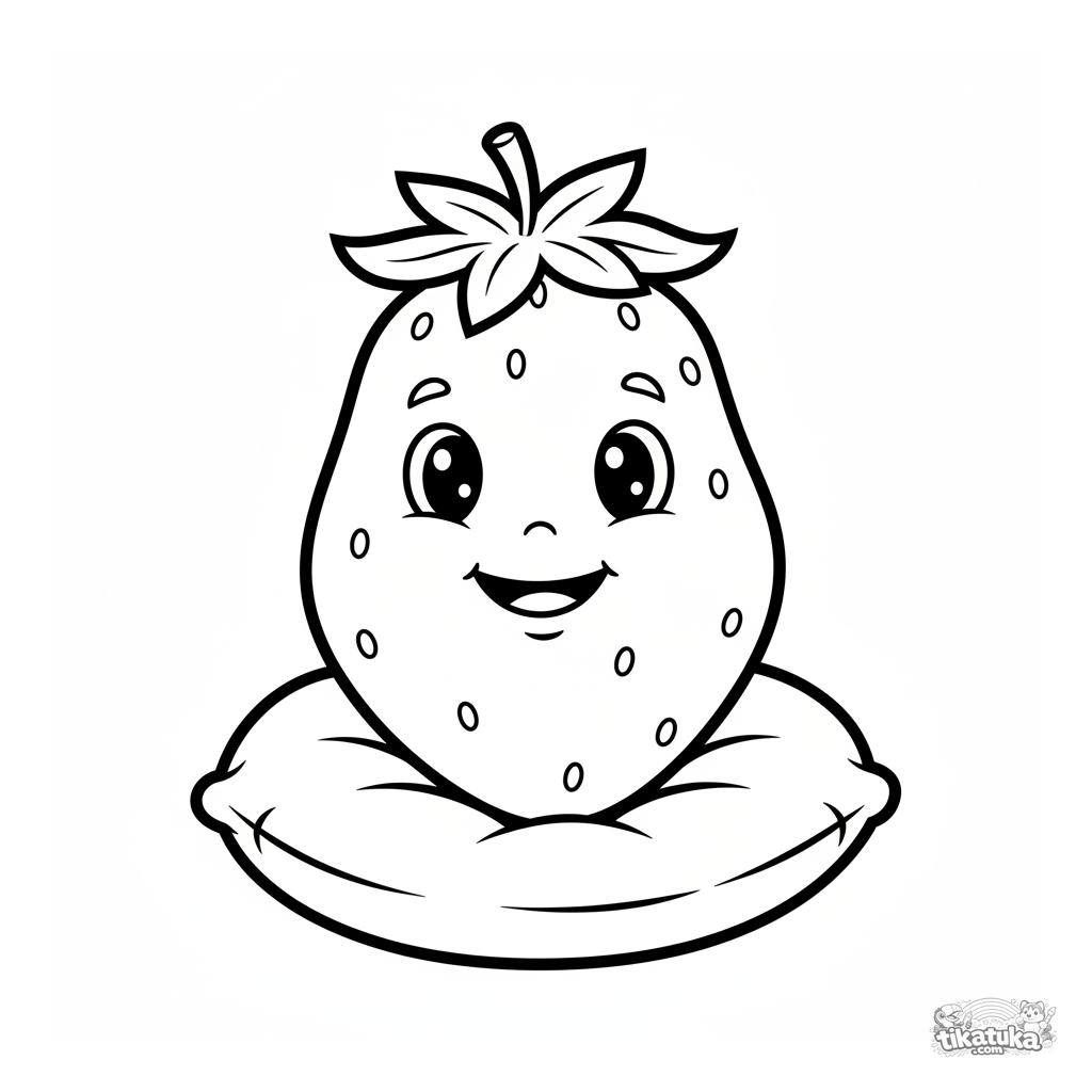 Раскраска для малышей: большая улыбающаяся клубничка с листочками на мягкой подушке. Чёткий контур, дружелюбное лицо, несколько семечек-точек, для детей 2-3 лет.