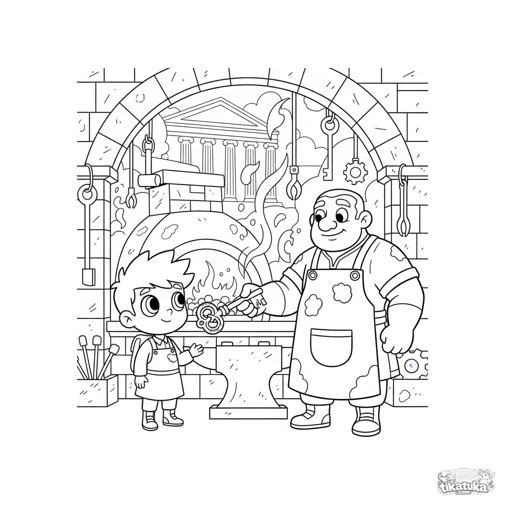 Раскраска для детей 6-11 лет: добрый бог-кузнец помогает путнику в своей кузнице при мраморном дворце. Много деталей инструментов и динамичная сцена.