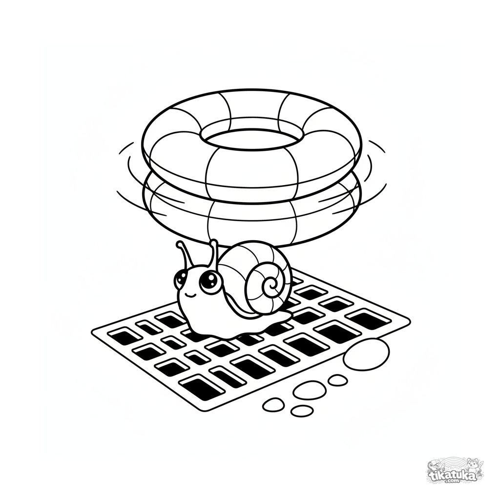 Раскраска для детей 7-9 лет: маленькая улитка ползёт по решётке слива на дне бассейна, над ней парит надувной круг. Чёткие контуры, геометрический стиль.