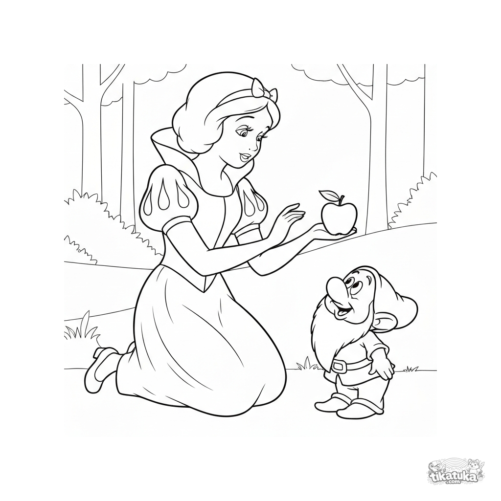 Раскраска для детей 3-5 лет. Белоснежка угощает яблоком гнома Простачка в лесу. Добрая сцена из сказки для малышей. Скачать бесплатно.