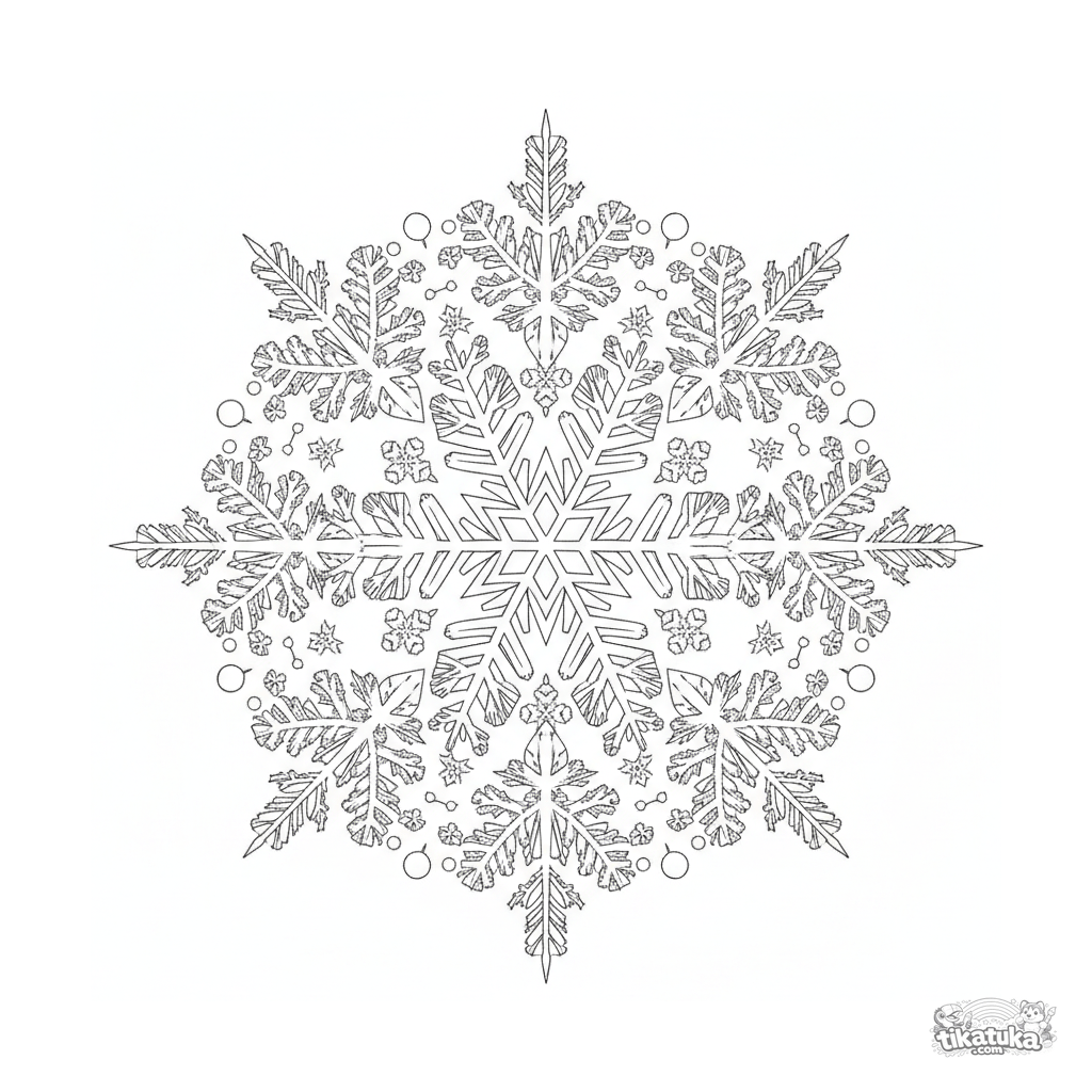 Сложная мандала-снежинка с шестилучевой симметрией для раскрашивания детьми 10-12 лет. Ледяные кристаллы, перистые узоры, тонкая гравировка.