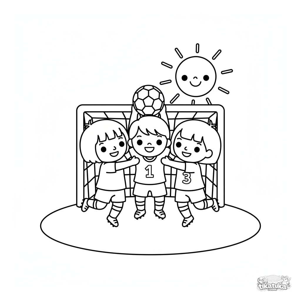 Раскраска для малышей 2-3 лет: весёлая футбольная команда детей прыгает от радости после забитого гола. Простая сцена с крупными фигурами.