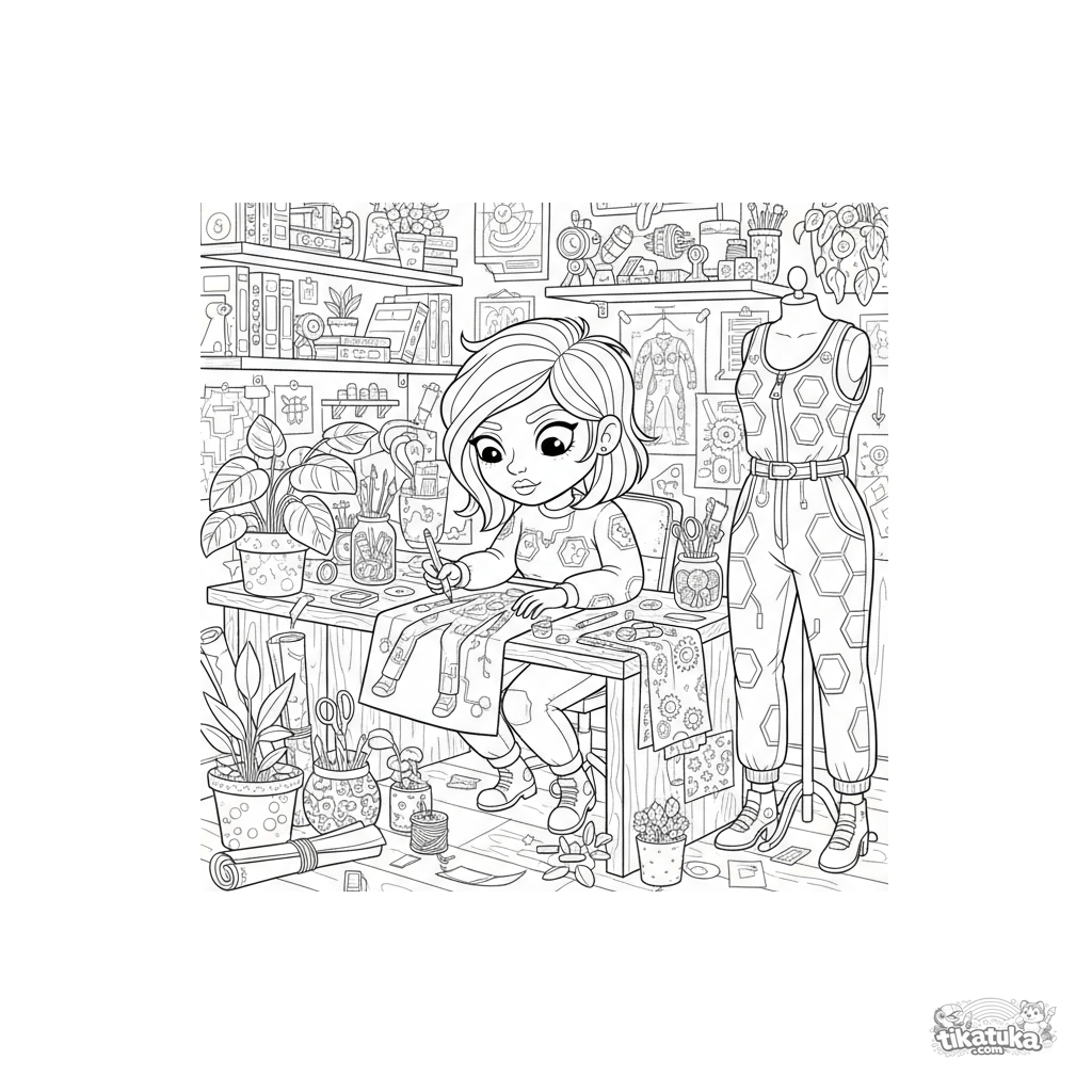 Сложная раскраска для девочек: дизайнер солярпанк-моды за работой в студии. Комбинезон с солнечными панелями, чертежи, растения, много деталей творческого процесса.