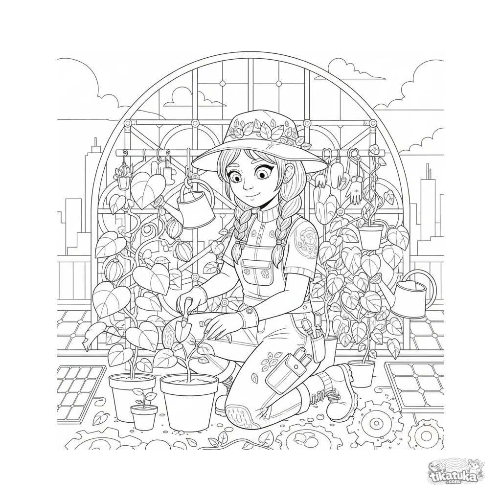 Сложная раскраска в стиле соларпанк для 10-12 лет: девушка в функциональном комбинезоне ухаживает за растениями в детализированной городской оранжерее на крыше.
