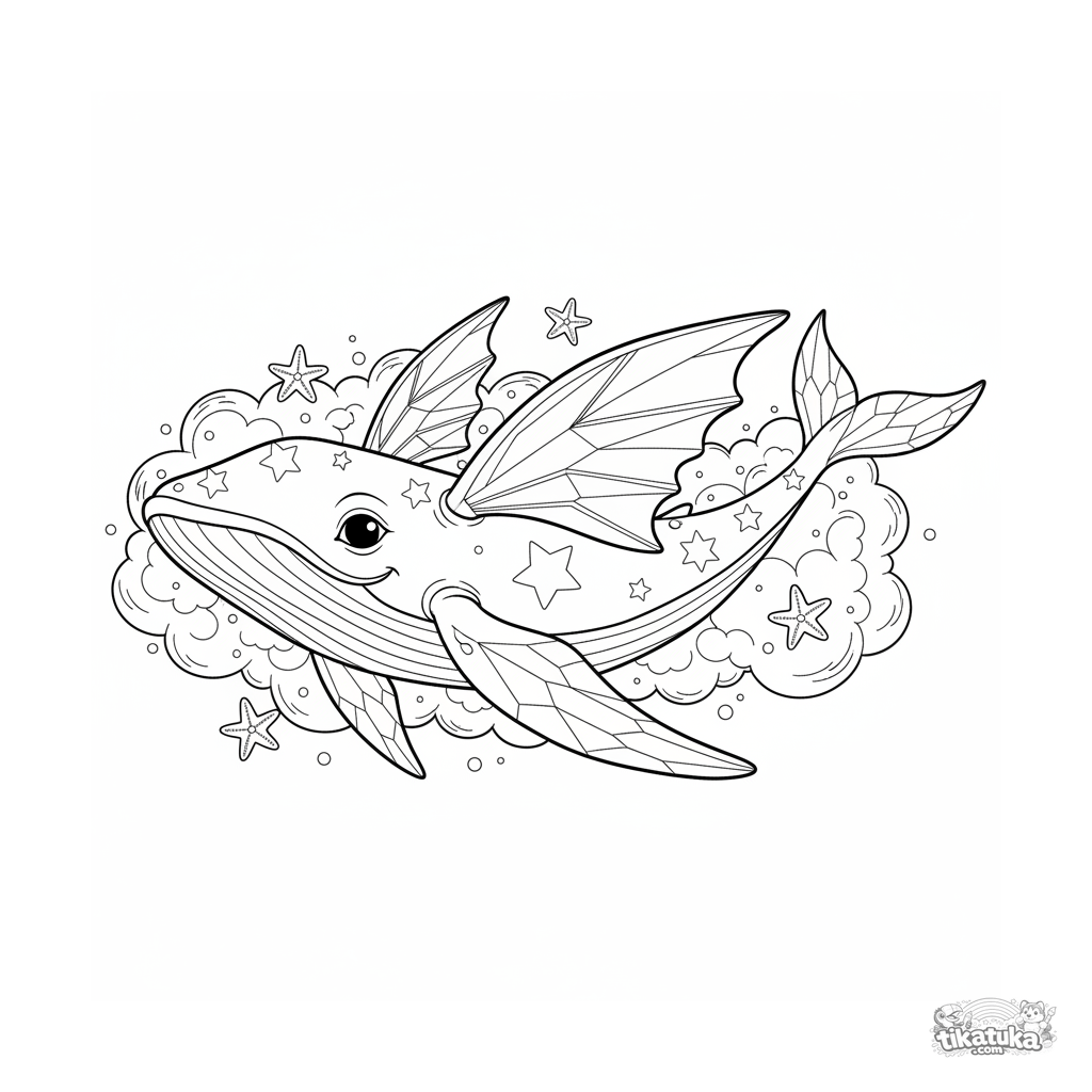 Раскраска для детей 7-9 лет: величественный космический кит плывёт сквозь звёздную пыль туманности. Детализированное фантастическое существо, плавные линии, атмосферная сцена.
