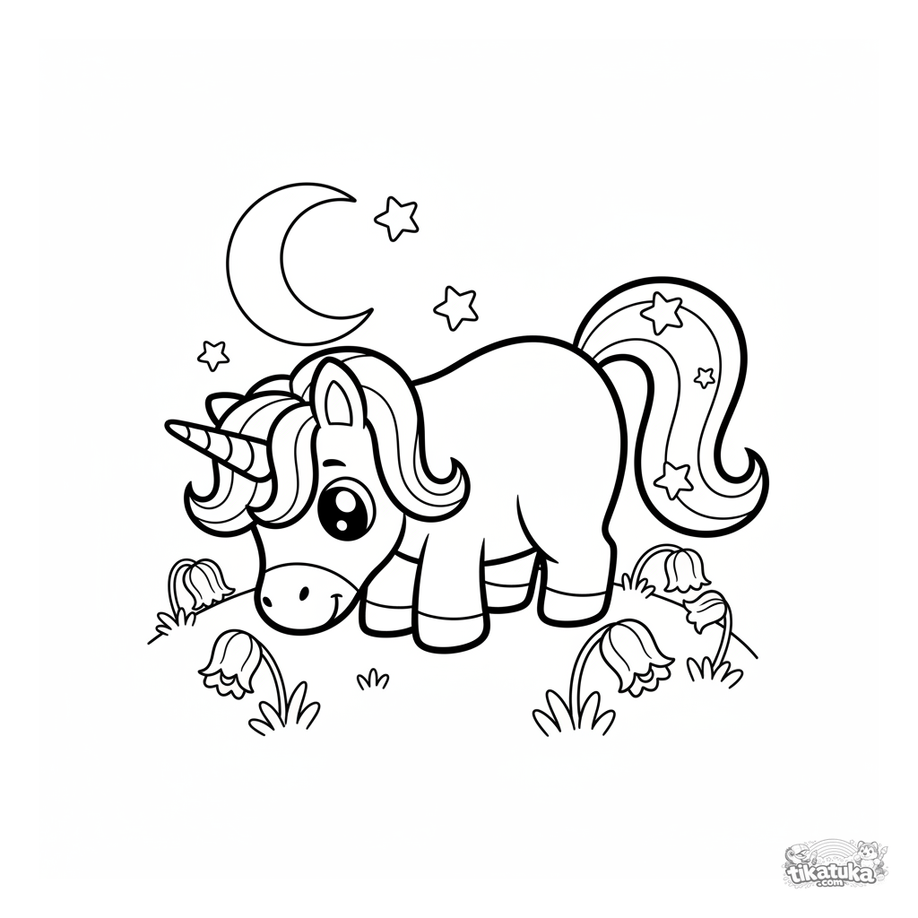 Простая раскраска с милым единорогом-пони на лугу для малышей 2-3 лет. Крупные формы, толстые контуры, минимум деталей — идеально для первых карандашей.