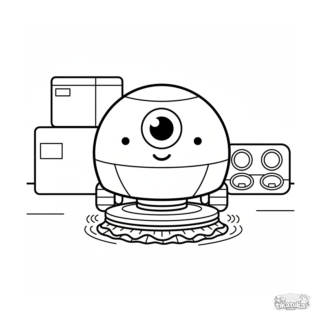 Раскраска для малышей: простой сферический робот-уборщик с одним глазом натирает пол на складе. Очень простые геометрические формы, крупные детали, широкие чистые поля для раскрашивания.