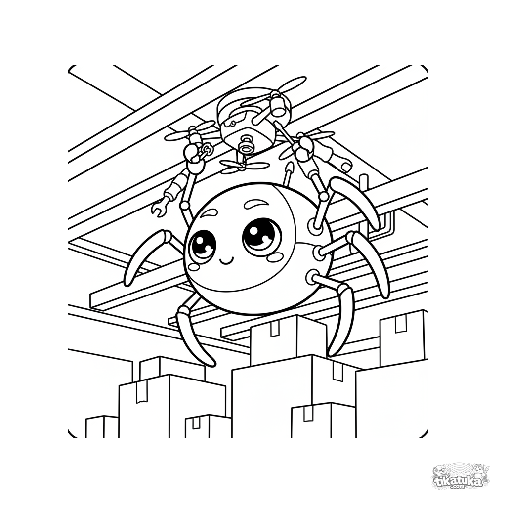 Раскраска для детей 7-9 лет: робот-паук ремонтирует дрон, зацепившись за потолок склада. Необычный ракурс, интересные детали, понятные контуры.