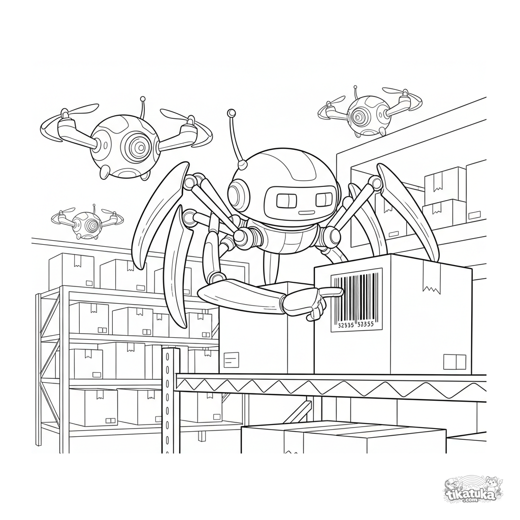 Раскраска для детей 7-9 лет: робот-паук с множеством ног и куполом-камерой проверяет штрих-код на коробке на высоком стеллаже склада, на фоне парящих дронов. Умеренная детализация.