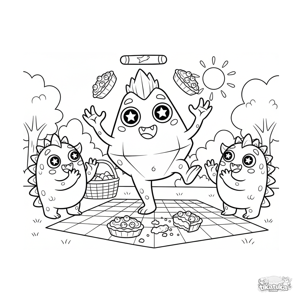 Раскраска для детей 7-9 лет: колючий монстр в ирокезе весело жонглирует ягодными тарталетками на пикнике, другие монстры наблюдают. Динамичная сцена.