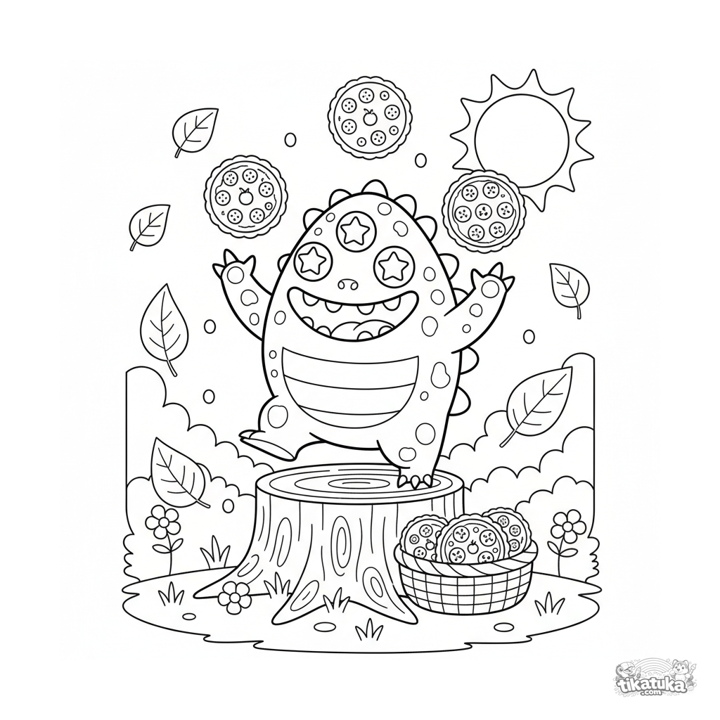 Раскраска для детей 7-9 лет: колючий монстр жонглирует фруктовыми тарталетками на лесной поляне для пикника. Динамичная поза, веселая атмосфера.