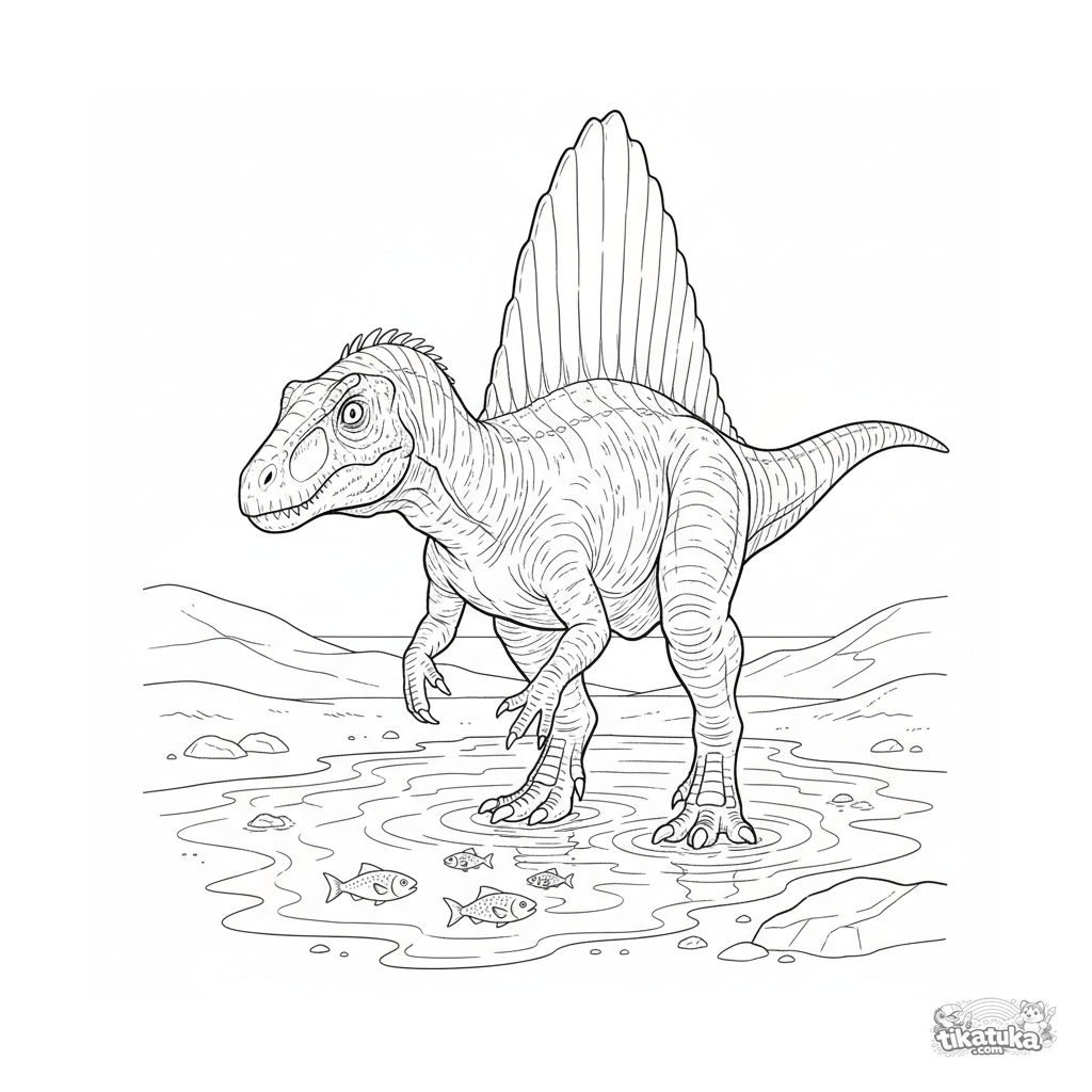 Раскраска для детей 10-12 лет: реалистичный спинозавр стоит на мелководье древнего океана, высматривая рыбу. Детальная анатомия, естественная поза, сложная сцена с водой и берегом.