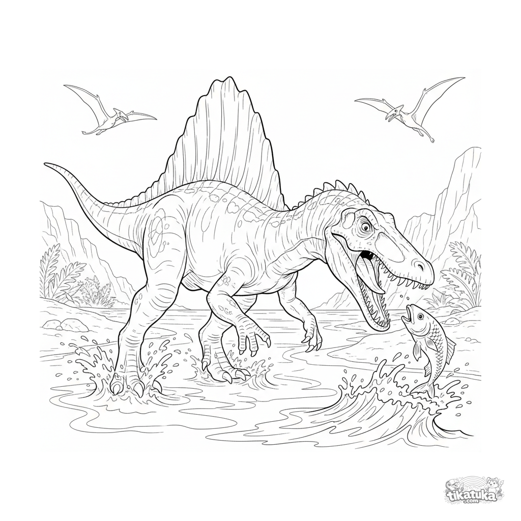 Раскраска для детей 10-12 лет: спинозавр ловит рыбу на мелководье у песчаного пляжа древнего океана. Высокий уровень детализации, анатомически точные формы.