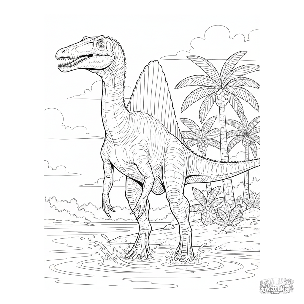 Раскраска для детей 10-12 лет: спинозавр с парусом на спине ловит рыбу в мелководной лагуне на пляже древнего океана. Детализированное реалистичное изображение.