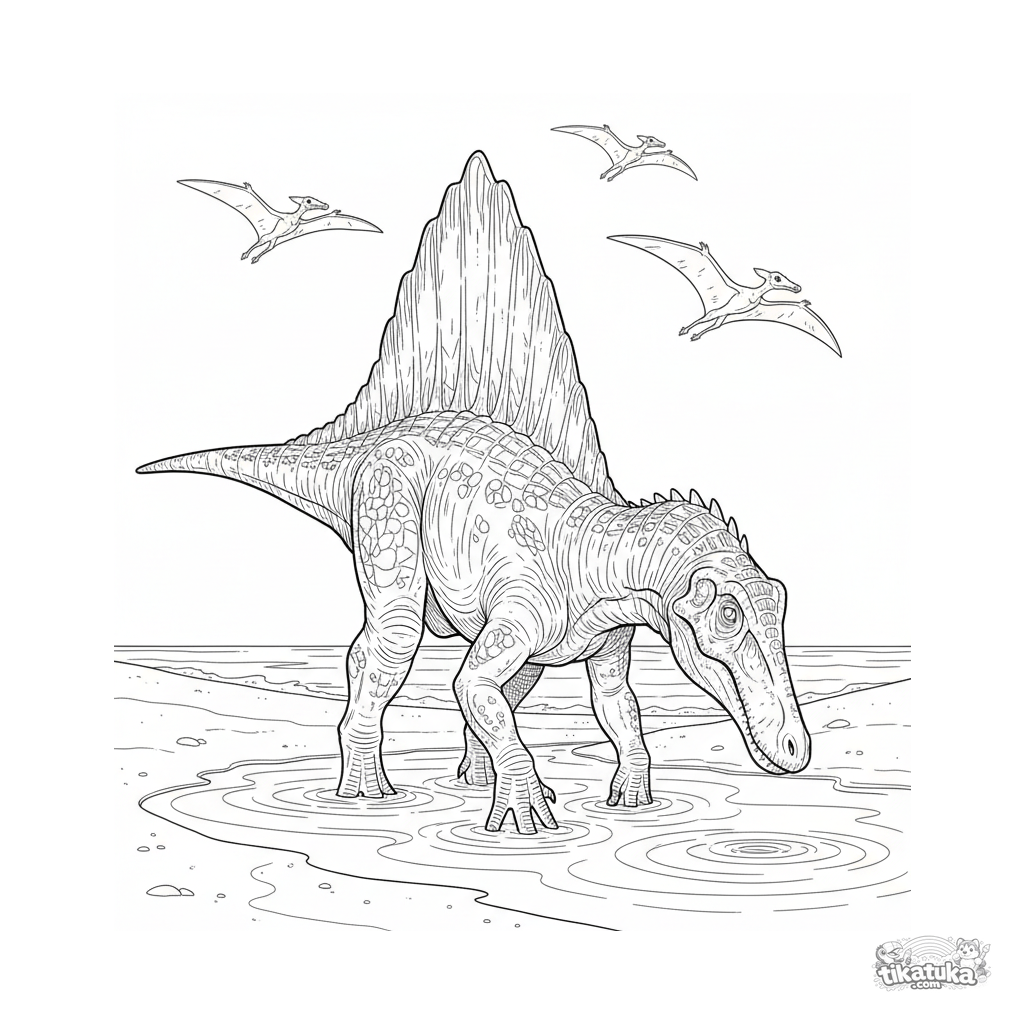 Детализированная раскраска для детей 10-12 лет: спинозавр бродит на мелководье у песчаного берега древнего океана. Реалистичная анатомия и среда.