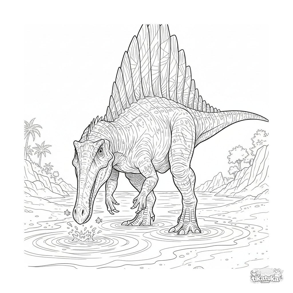 Раскраска для детей 10-12 лет: спинозавр осторожно бродит на мелководье древнего океана, выслеживая добычу. Детализированная анатомия, текстуры, сложный фон.