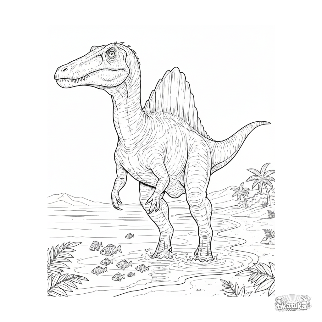 Сложная раскраска для детей 10-12 лет: спинозавр с высоким парусом стоит на мелководье у песчаного берега древнего океана. Детальная анатомия.