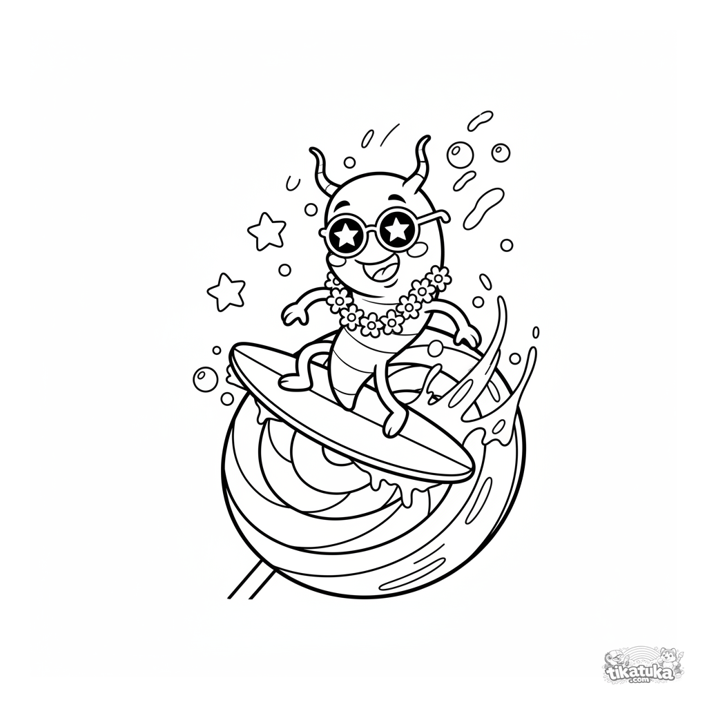 Раскраска для детей 7-9 лет: спиральный микроб в стиле ретро-мультфильмов катается на серфе по поверхности яркого леденца. Весёлая и динамичная сцена для творчества.