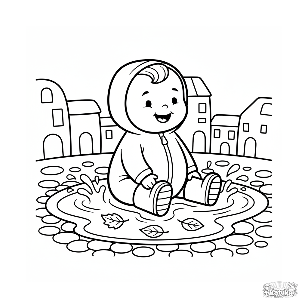 Раскраска для малышей 2-3 лет: ребенок в дождевике сидит и плещется в луже на деревенской площади осенью. Очень простые формы, большие области для раскрашивания.