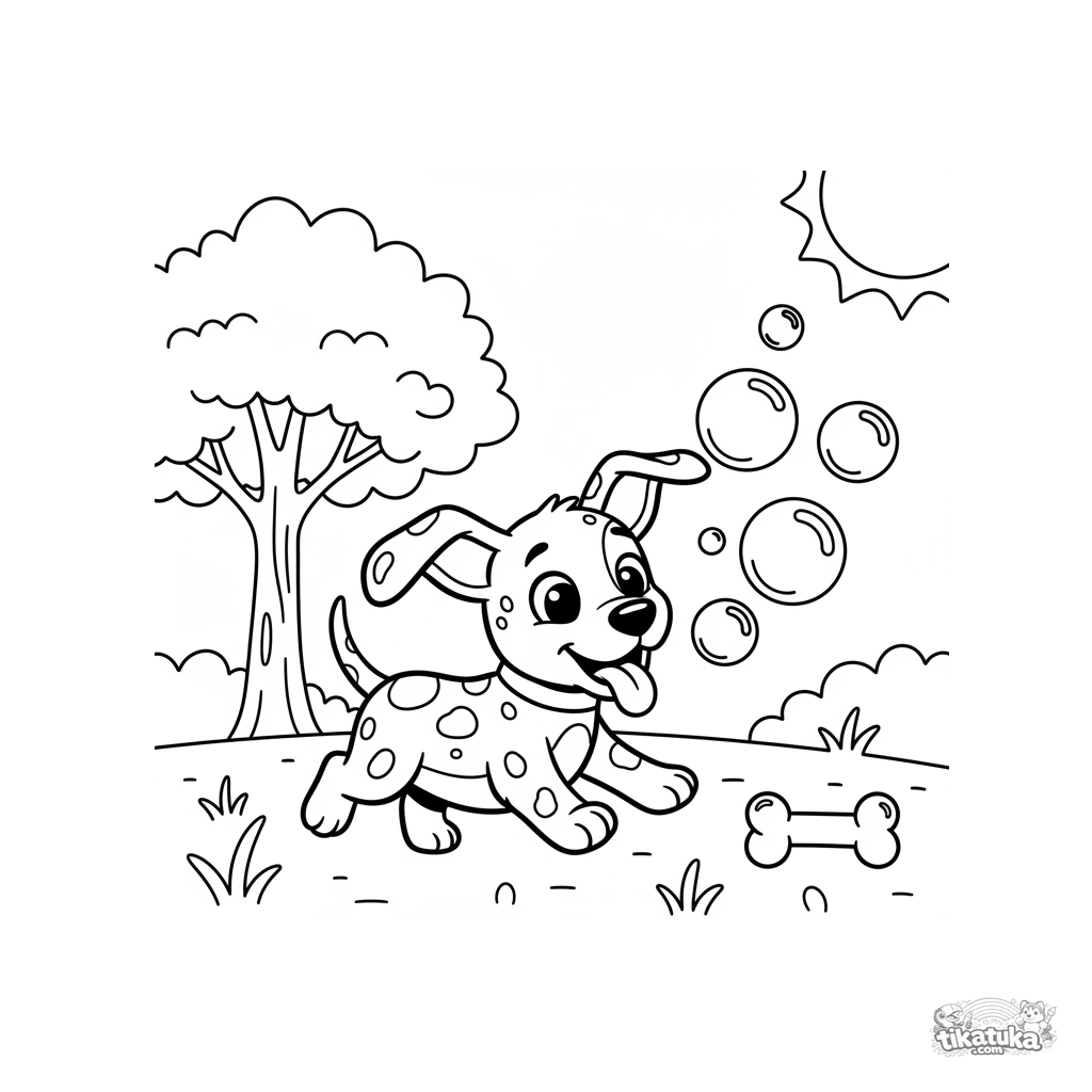 Раскраска для малышей: весёлый щенок далматина гоняется за мыльными пузырями на солнышке. Простые крупные формы, идеально для детей 2-4 лет.