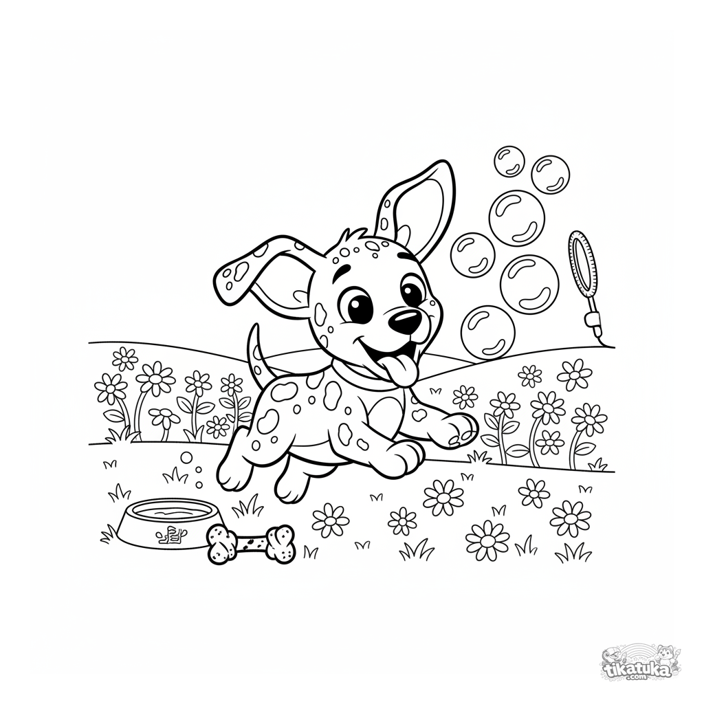 Раскраска для детей 3-6 лет: весёлый щенок далматина гоняется за пузырями на солнечном лугу. Простые детали для лёгкого раскрашивания.