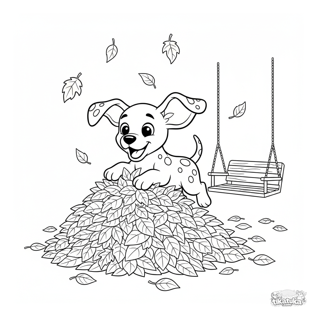Раскраска для детей 3-6 лет: веселый щенок далматина играет в куче осенних листьев на заднем дворе. Простые и четкие контуры идеально подходят для малышей.