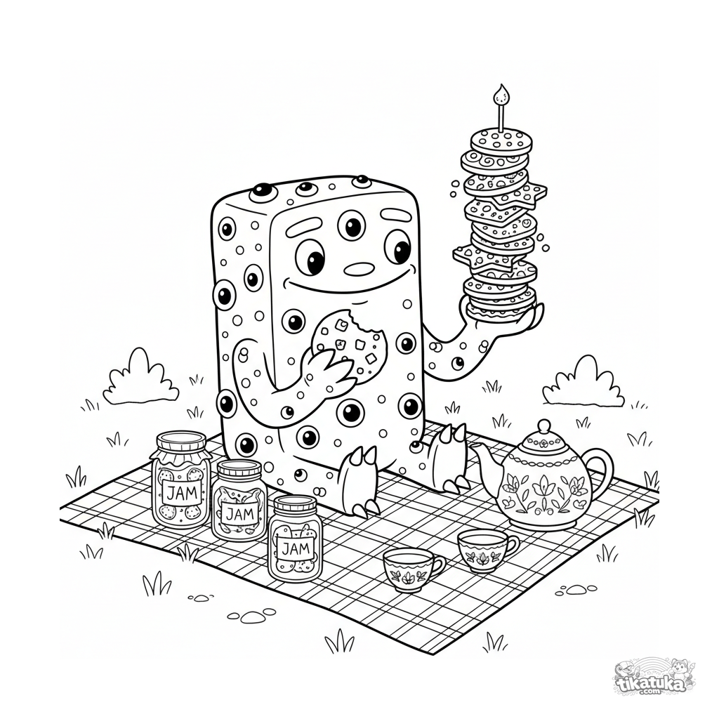 Детальная раскраска для детей 10-12 лет: квадратный монстр с множеством глаз строит башню из печенья на пикнике. Реалистичный стиль, много элементов: банки, чайник, одеяло.