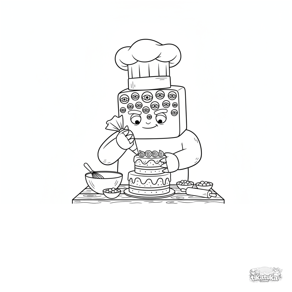 Детальная раскраска для детей 10-12 лет: квадратный монстр-кондитер в колпаке украшает многослойный торт на пикнике. Много элементов для творческого раскрашивания.