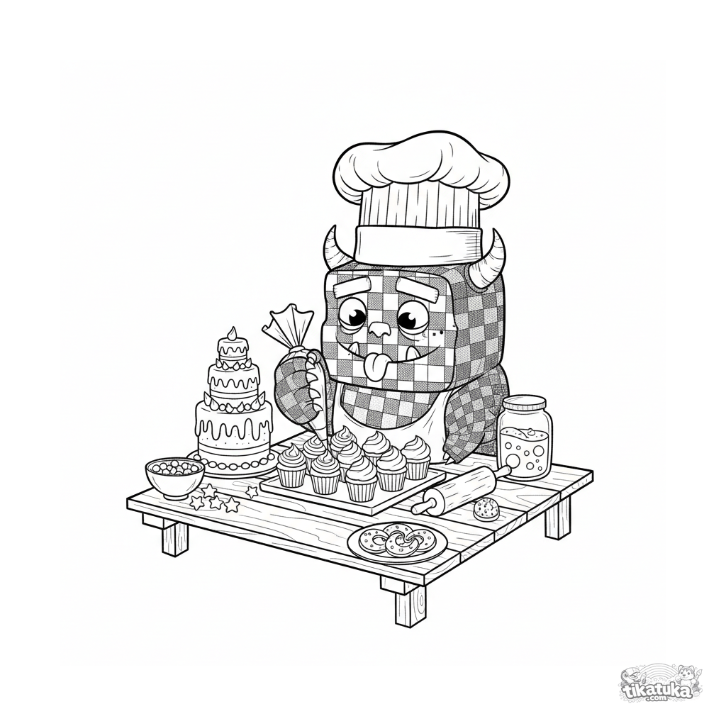 Детальная раскраска для детей 10-12 лет: квадратный монстр в шляпе шефа украшает кексы на пикнике со сладостями. Четкие контуры, много элементов для раскрашивания.