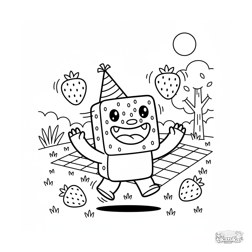 Раскраска для детей 4-6 лет: весёлый квадратный монстр жонглирует клубникой на поляне для пикника. Яркая, динамичная сцена для раскрашивания.
