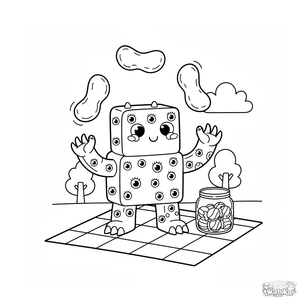 Раскраска для детей 4-6 лет: квадратный монстр с множеством глаз жонглирует гигантскими мармеладками на пикнике. Весёлая и простая сцена.