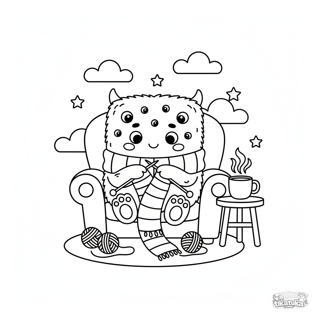 Раскраска для детей: квадратный пушистый монстр с множеством глаз вяжет длинный шарф в уютном кресле. Спокойная и тёплая сцена для раскрашивания.