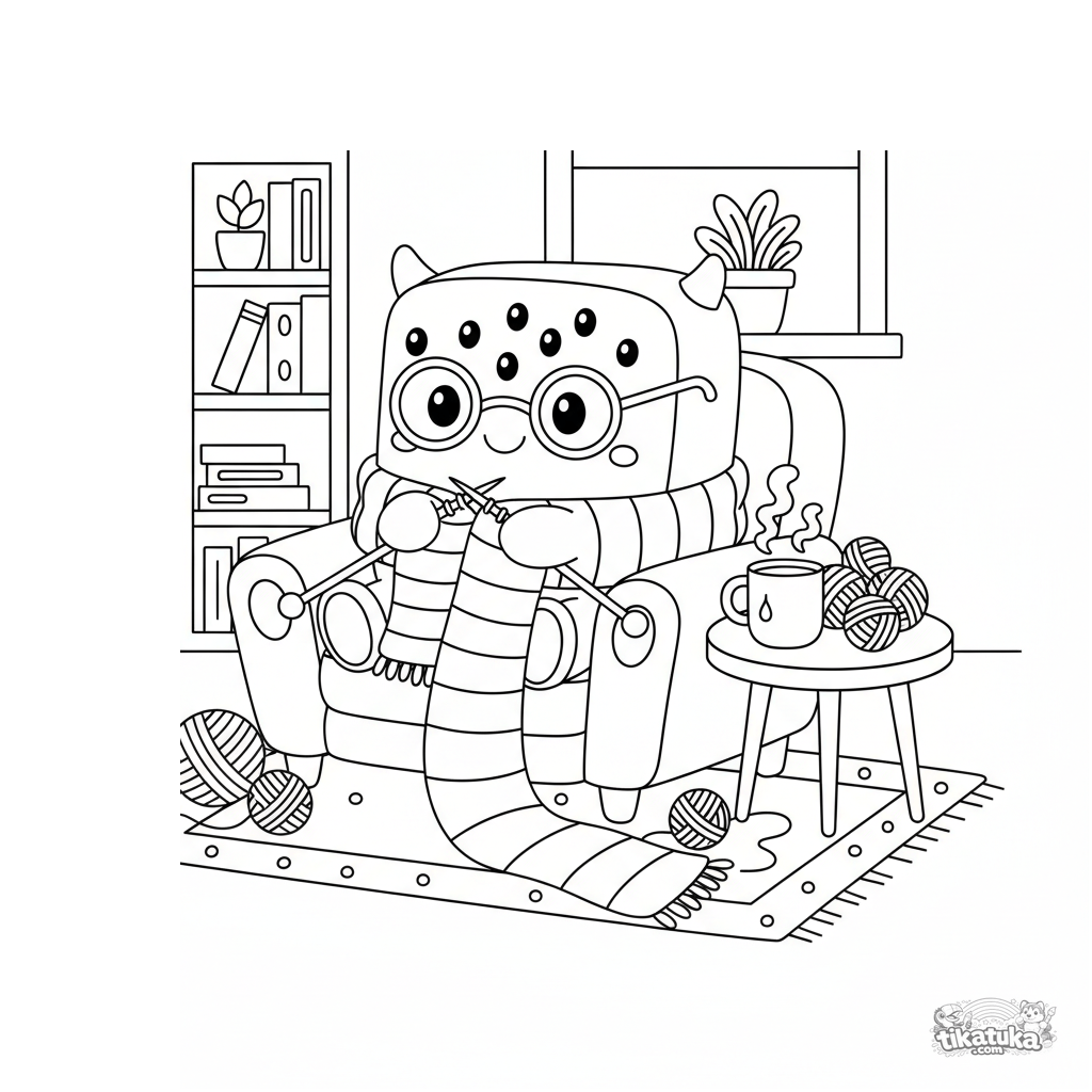 Раскраска для детей: квадратный монстр с множеством глаз вяжет шарф в уютном кресле. Спокойная и милая сцена для раскрашивания.