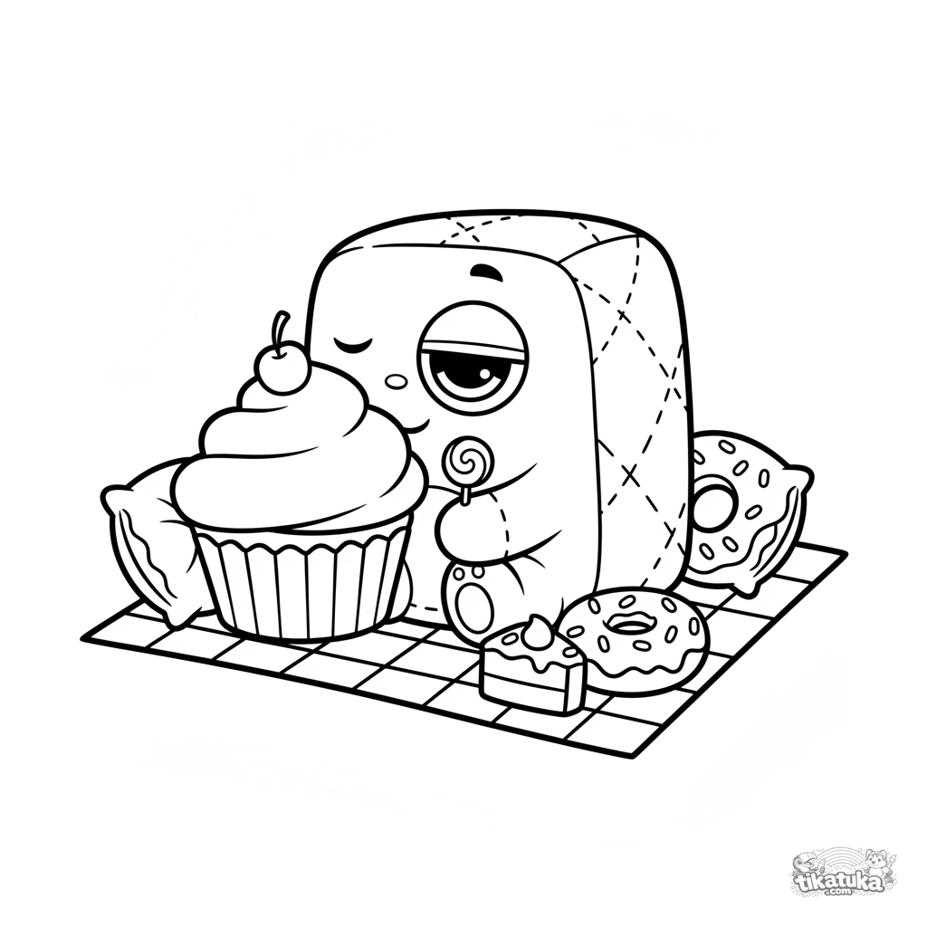Простая раскраска для малышей: квадратный монстр спит на подушке-кексе на пикнике. Крупные формы, мало деталей. Для детей 2-3 лет.