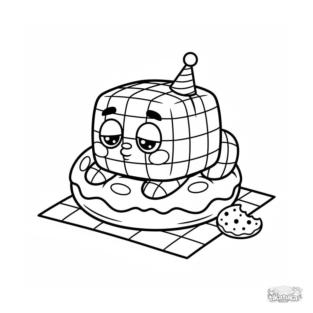 Простая раскраска для малышей: квадратный монстр спит на пончике на пикнике. Крупные формы, мало деталей. Для детей 2-3 лет.