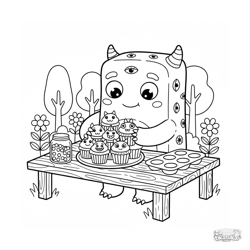 Раскраска для детей 4-6 лет: квадратный монстр с множеством глазков сортирует кексы на пикнике. Простые формы, понятный сюжет.