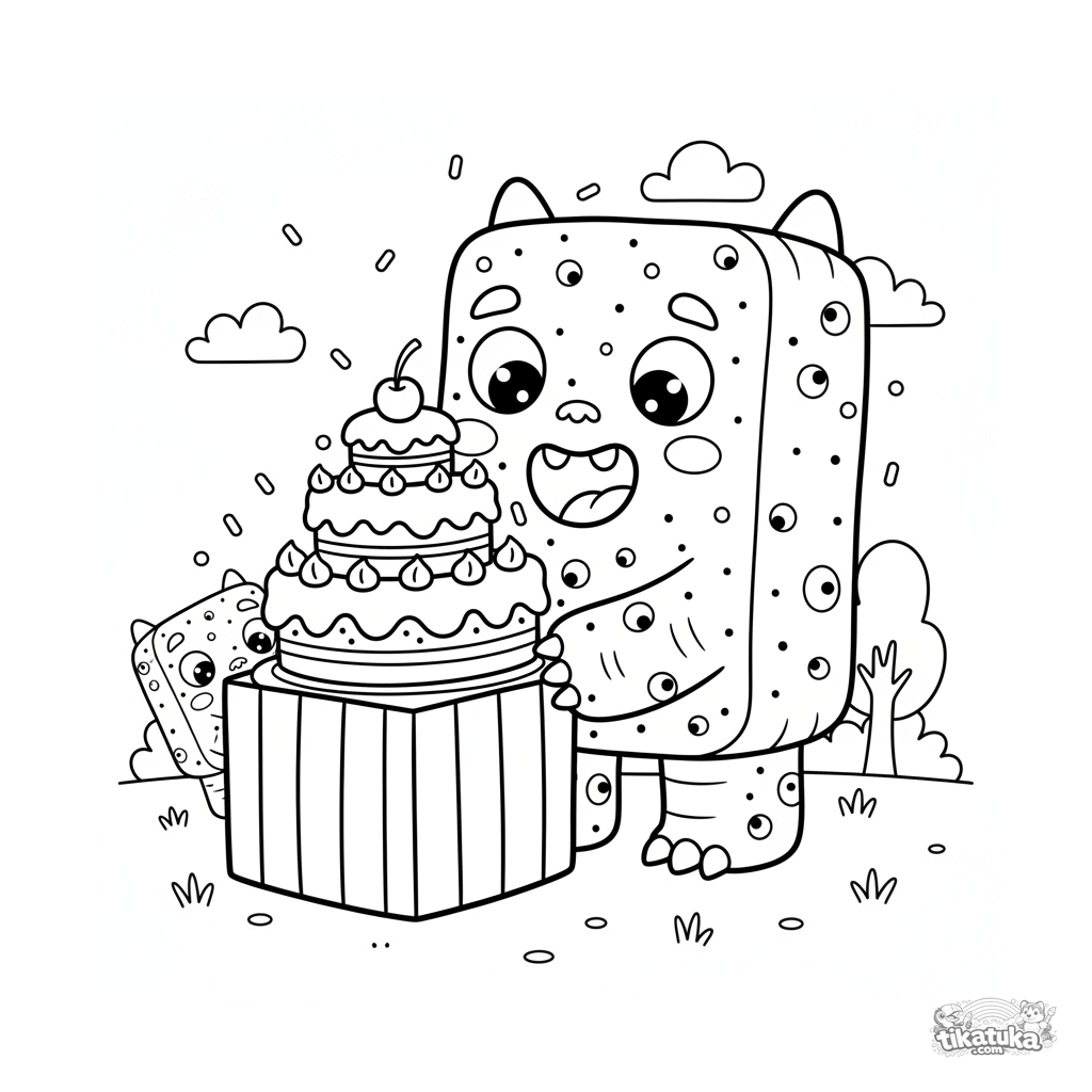 Раскраска для детей 7-9 лет: квадратный монстр с множеством глаз радостно распаковывает огромный торт на пикнике. В сцене есть конфетти и другой монстр.