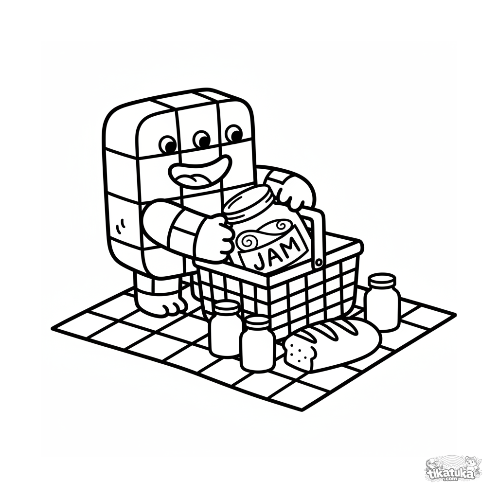 Простая раскраска для малышей 2-3 лет: квадратный монстр с вареньем на пикнике. Крупные формы, четкие контуры, минимум деталей.