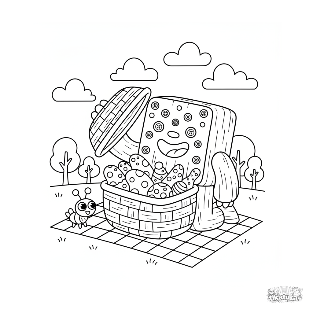 Раскраска квадратного монстра, который с радостью распаковывает корзинку с желейными бобами на пикнике. Для детей 4-6 лет. Простые формы и весёлая сцена.