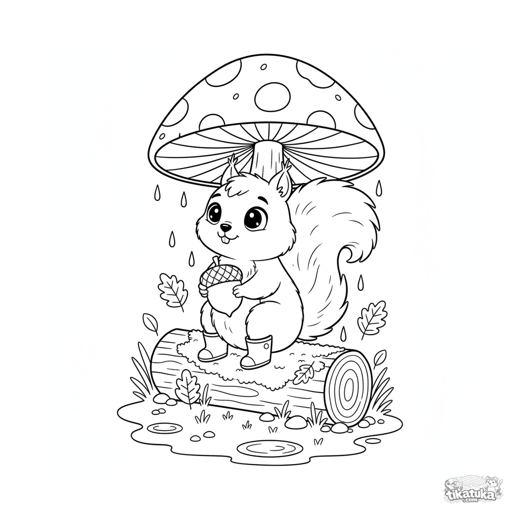 Раскраска для детей 4-6 лет: пушистая белка в сапожках прячется от дождя под большим грибом, держа жёлудь. Осенний лес, лужи и листья на земле.