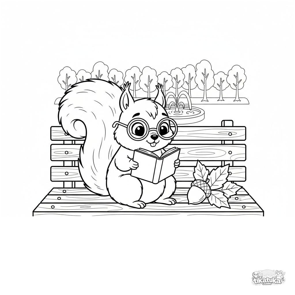 Раскраска для детей 4-6 лет: белка в очках читает книгу на скамейке в городском парке. Милая осенняя сцена с фонтаном на заднем плане.