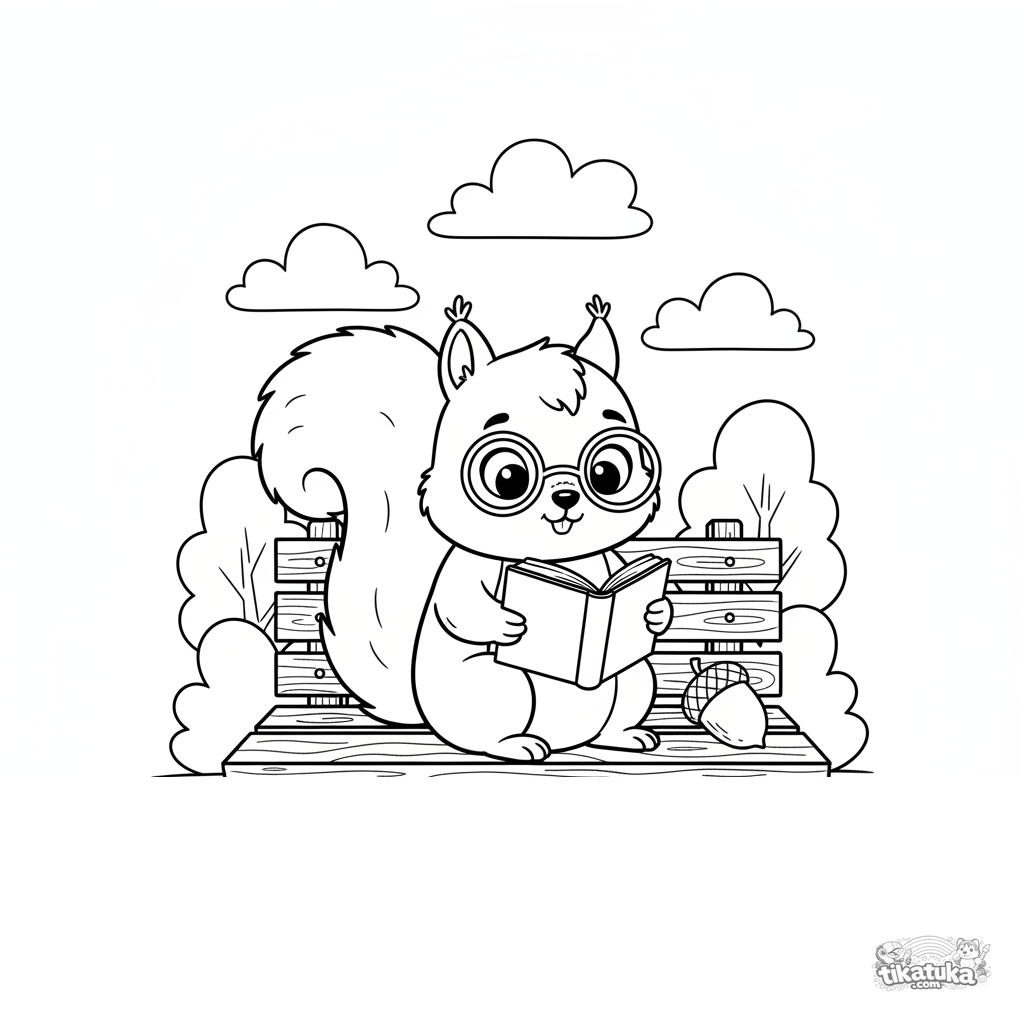 Раскраска для детей 7-9 лет: белка в очках сосредоточенно читает книгу, сидя на скамейке в городском парке. Милая осенняя сцена.